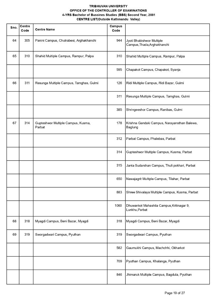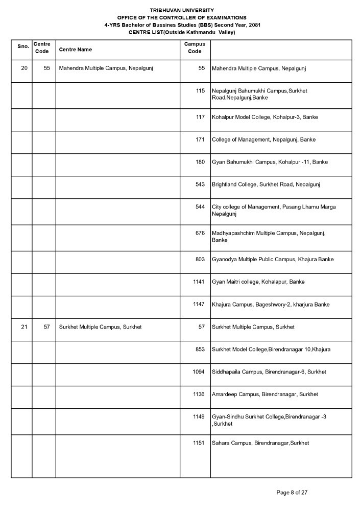 4-YRS Bachelor of Bussines Studies (BBS) First Year, 2081 ,Regular CENTRE LIST(Outside Kathmandu Valley)